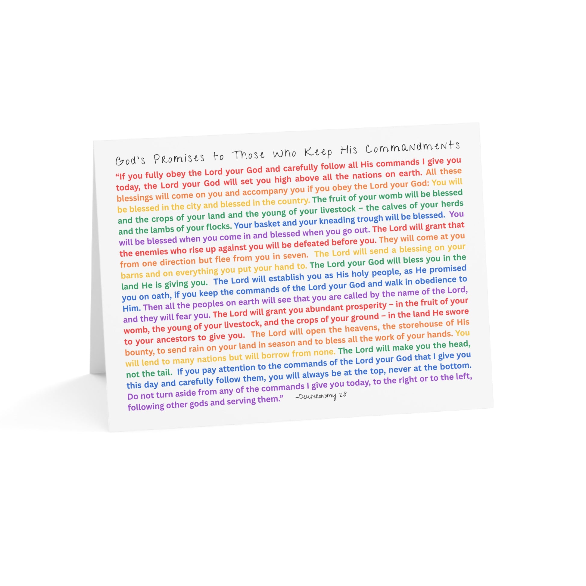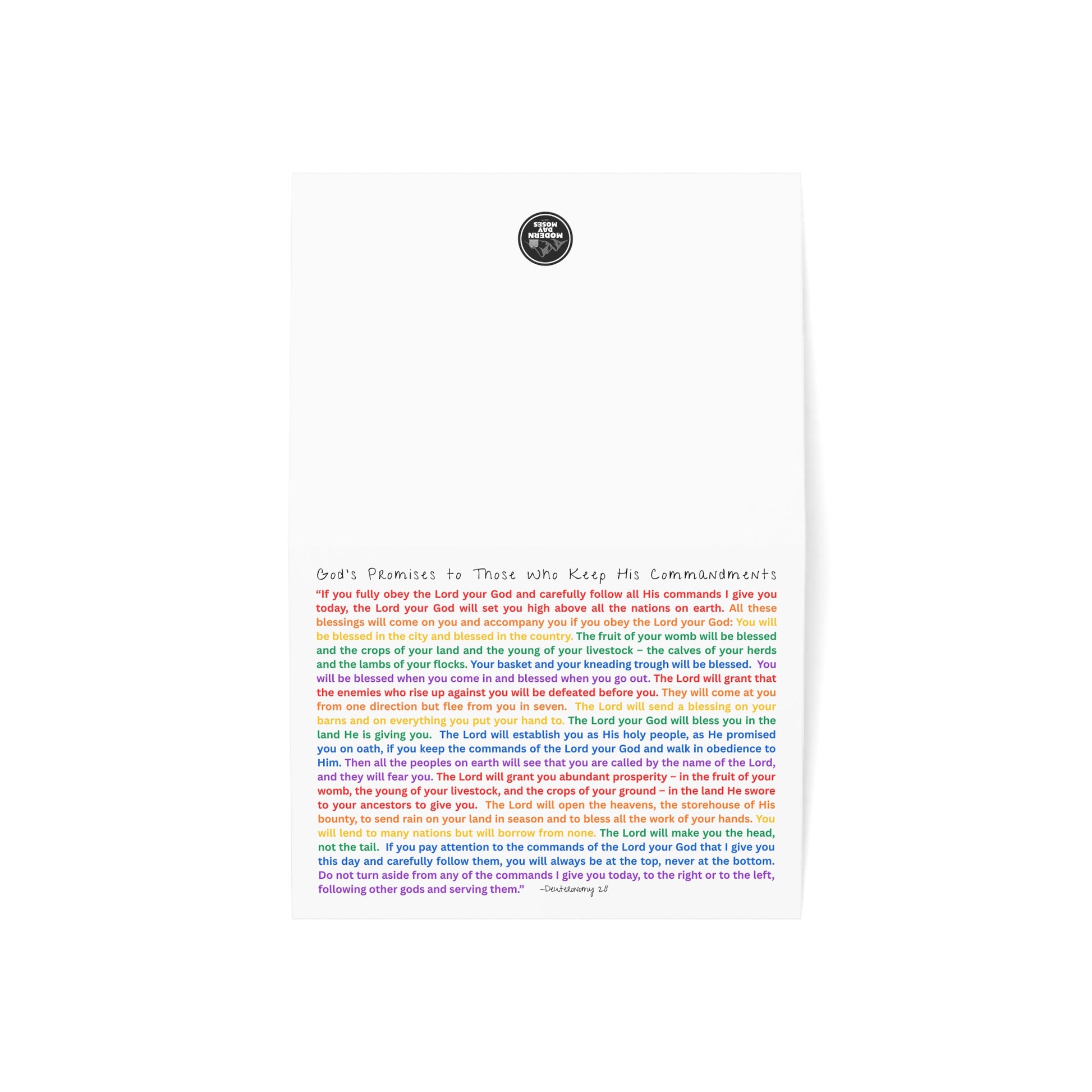 What better way to share the positive message of God's blessings for obedience of the Ten Commandments than with a handwritten note to someone you care about on a customized card like these from Modern Day Moses. This design has been crafted with care to highlight the hope of Deuteronomy 28 written in the colors of the rainbow to remind us of God's everlasting covenant with His people.