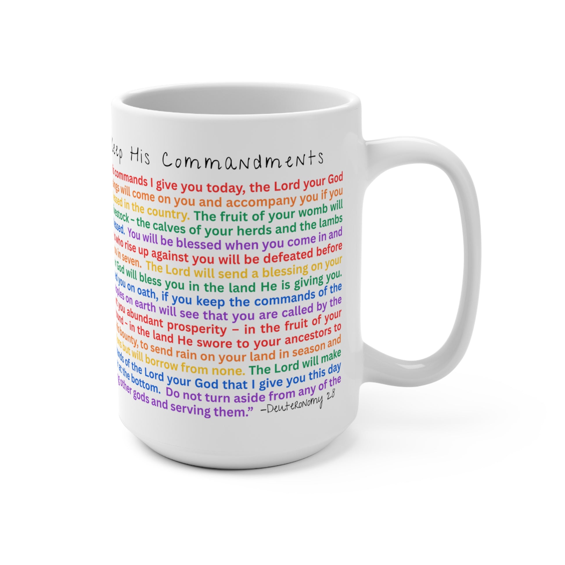 Start your day with a beautiful reminder of God's faithful promise to bless you when you obey His commandments! Introducing a beautifully designed 15oz mug that blends functionality with uplifting inspiration. This ceramic mug features a vibrant, multicolored design in the colors of the rainbow, God's original symbol of His everlasting covenant with His people, celebrating love and devotion and making it the perfect companion for your morning coffee or evening tea. Whether you're at home or in the office, its generous size allows you to savor your favorite beverages while uplifting your spirit with powerful messages. Ideal for anyone who appreciates thoughtful gifts, this mug is a meaningful choice for holidays like Christmas, birthdays, or as a simple encouragement for friends and family. Enjoy the warmth it brings to your daily routine and share the positivity with others!