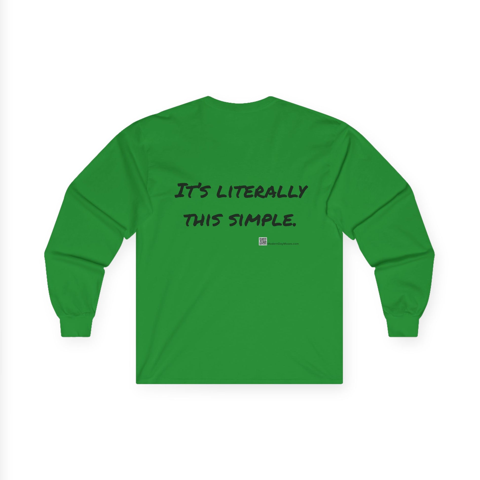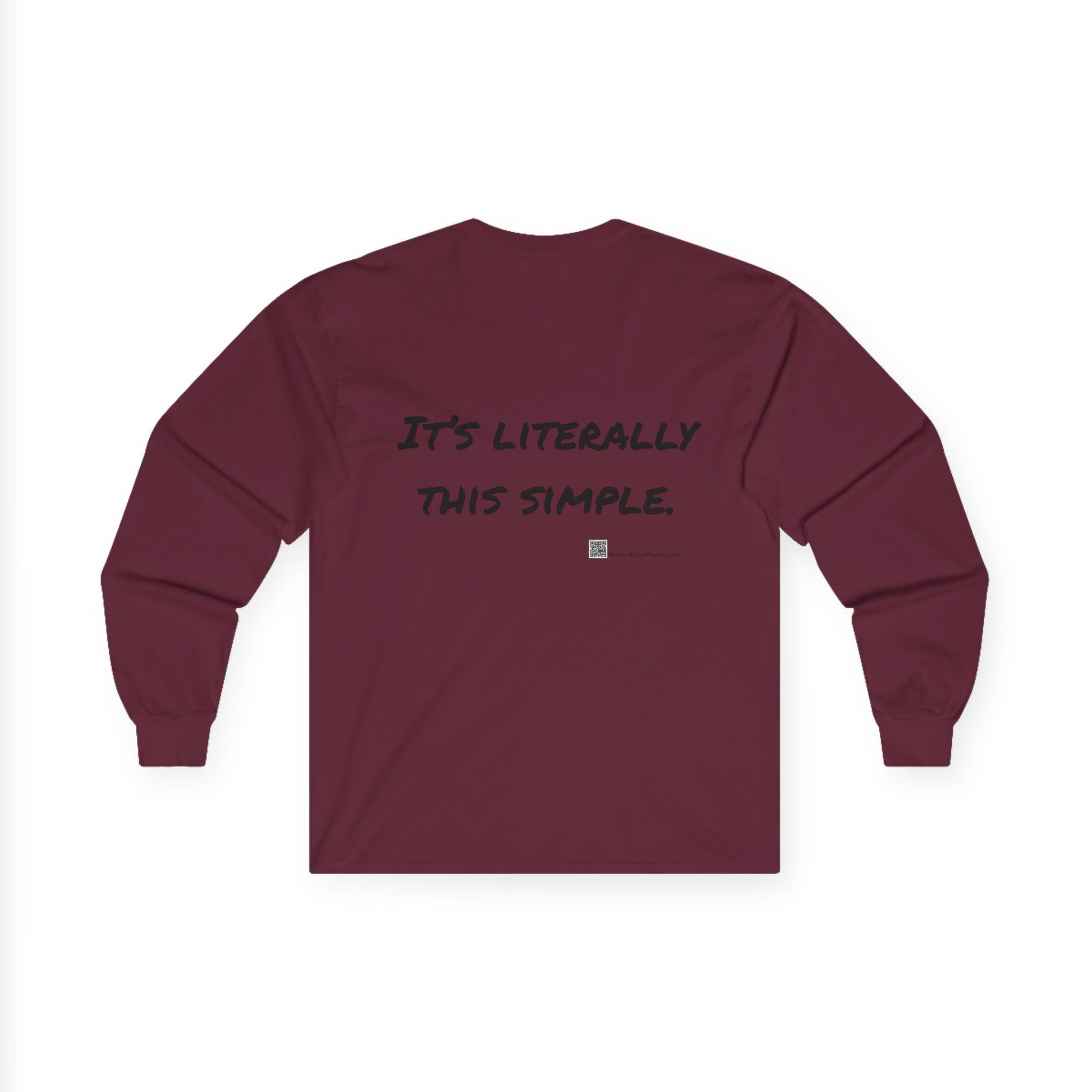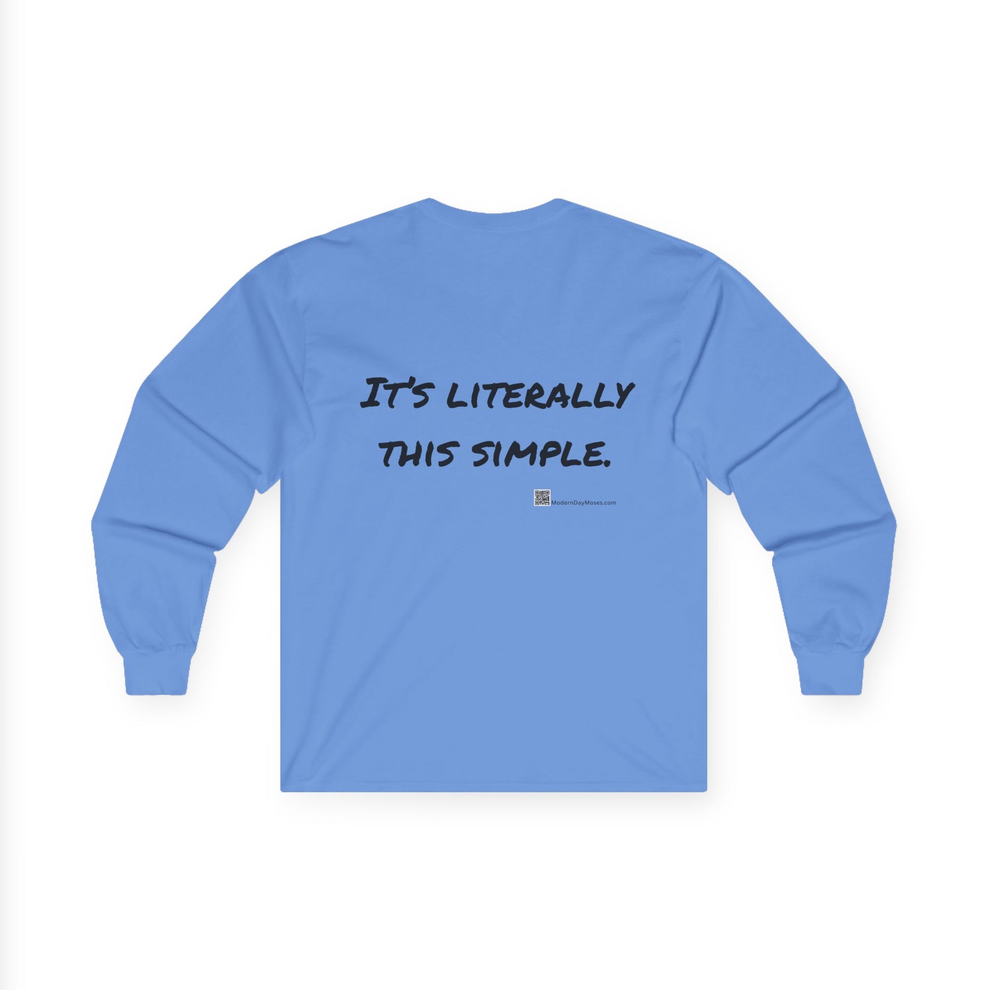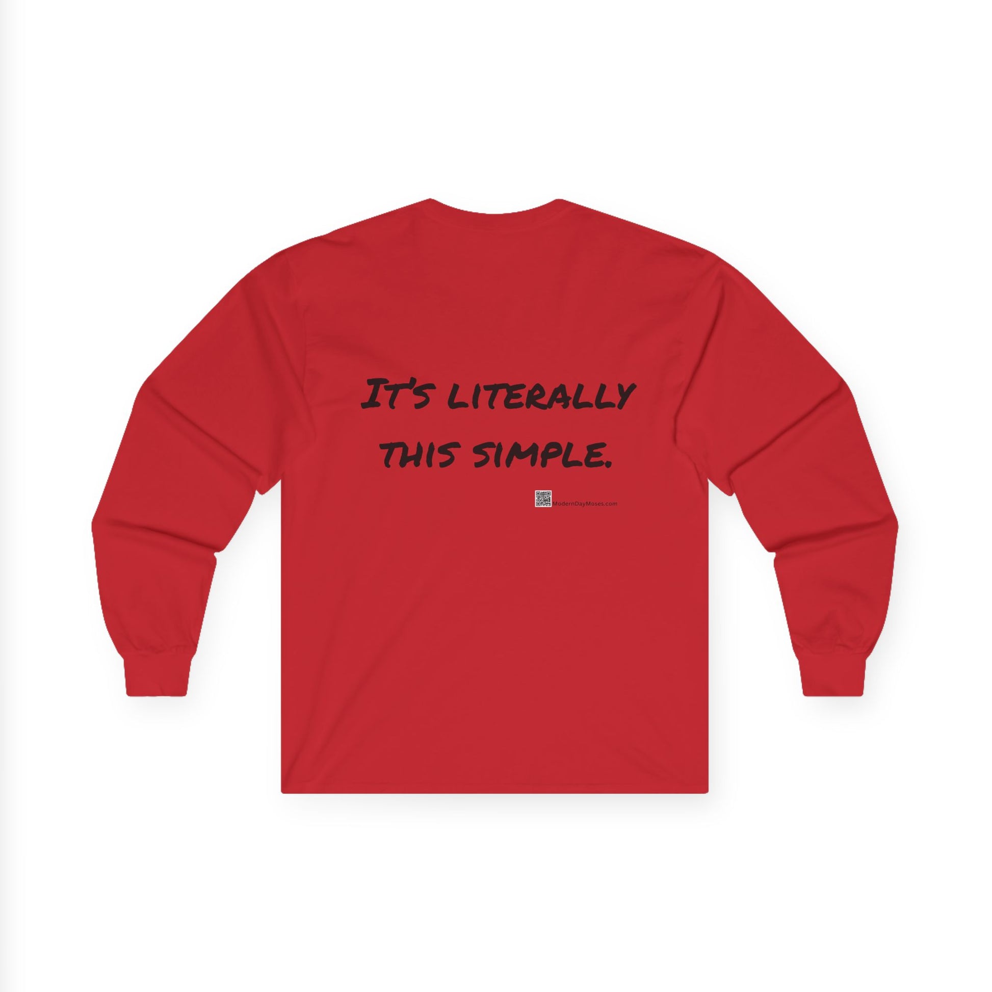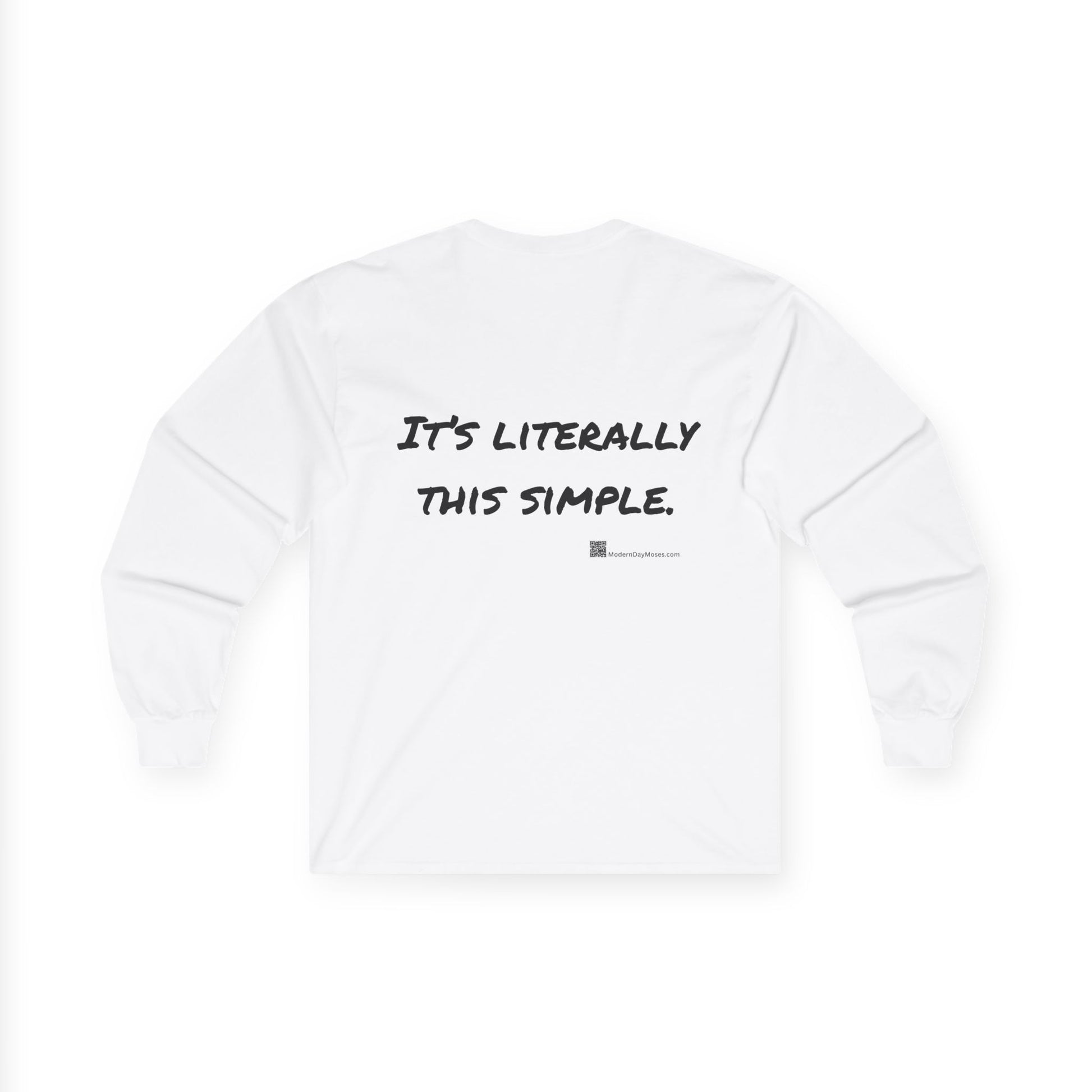 Wear your faith boldly with this Modern Day Moses long-sleeve cotton shirt — a timeless reminder of God’s unchanging commandments for the world. Comfortable, durable, and designed for everyday discipleship, it’s faithwear that speaks truth and makes a positive statement wherever you go. Modern Day Moses brings you a cool-weather option to promote the Ten Commandments. MDM logo in front, and It's Literally This Simple message on back.